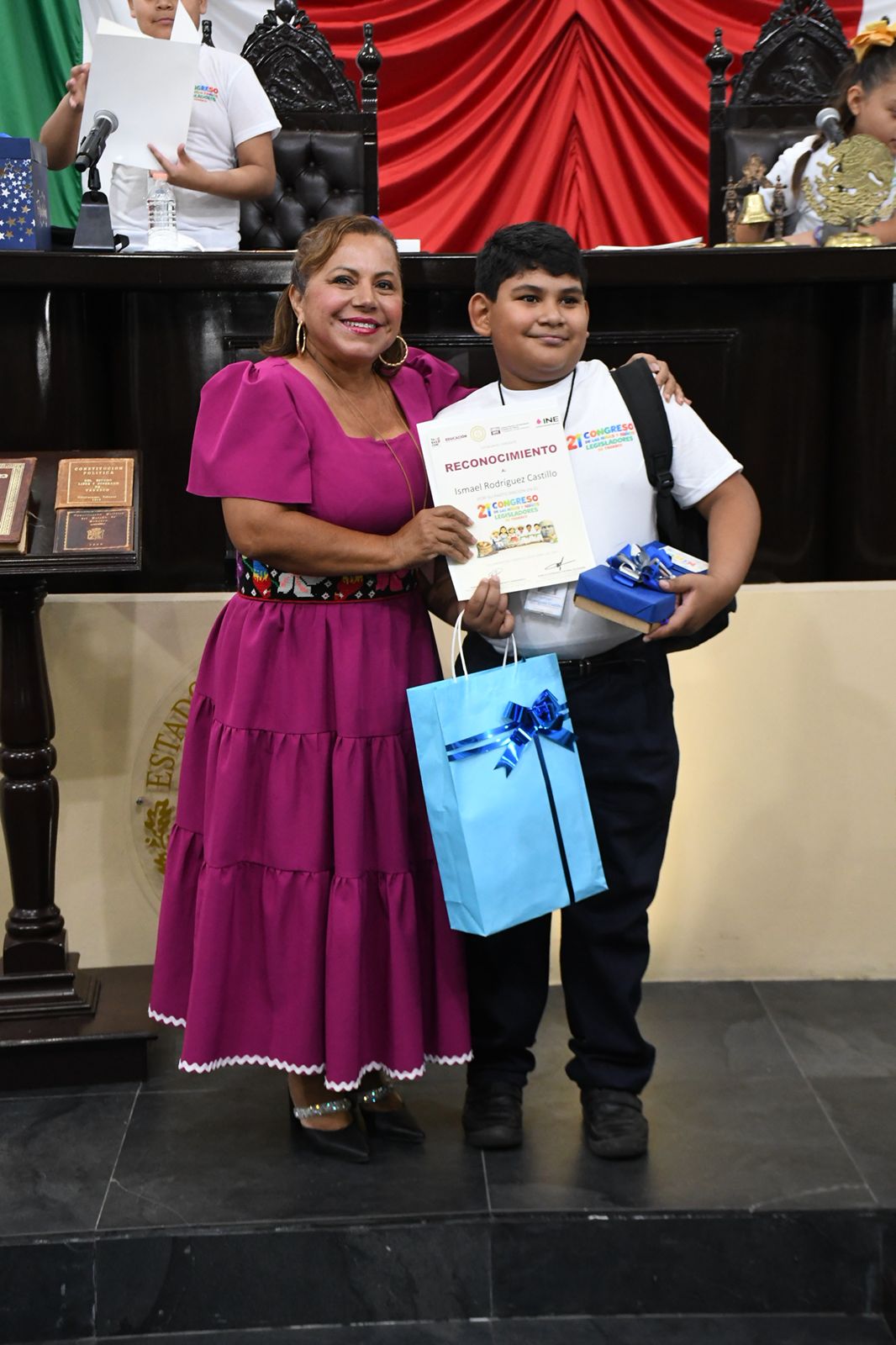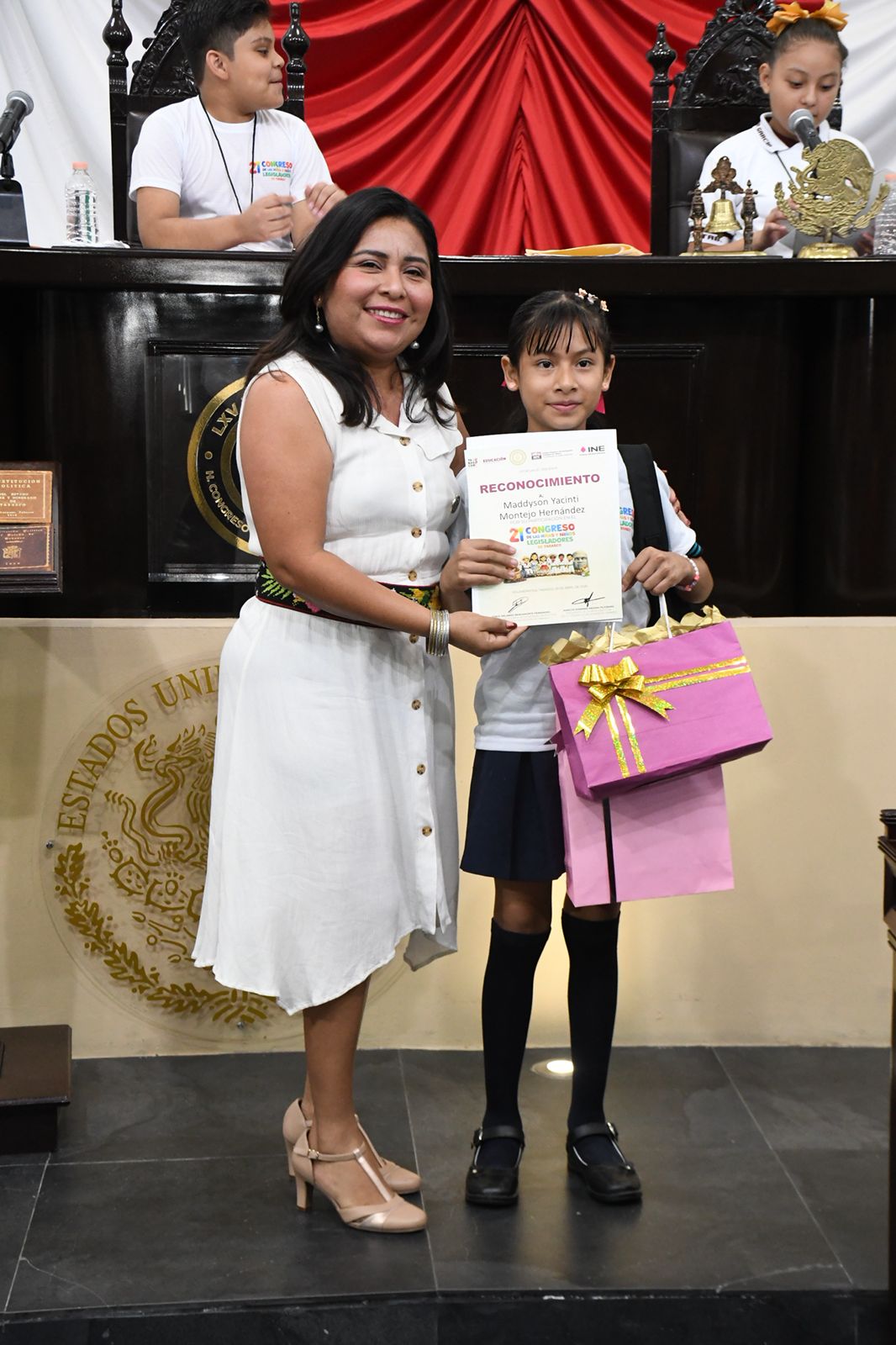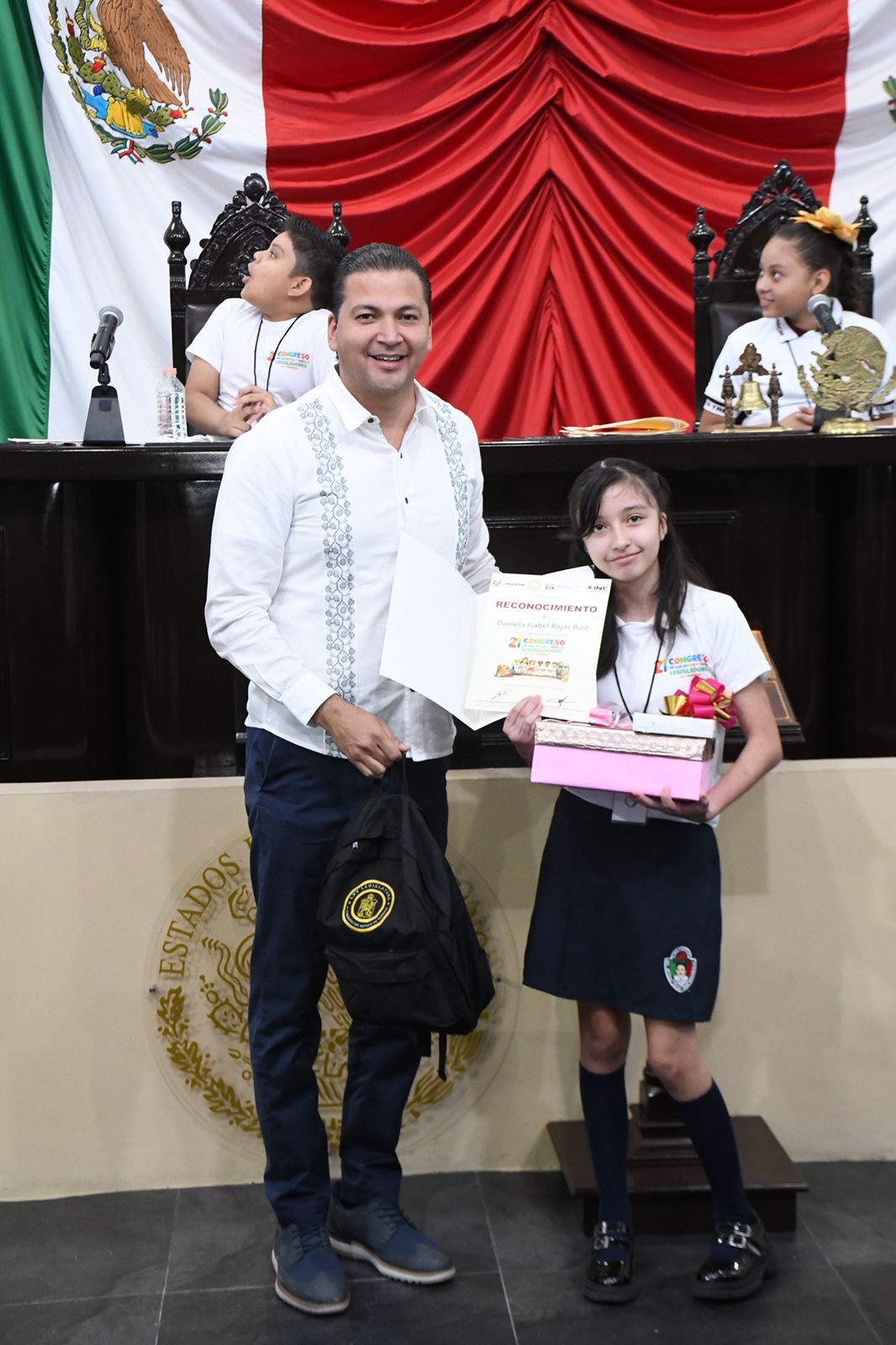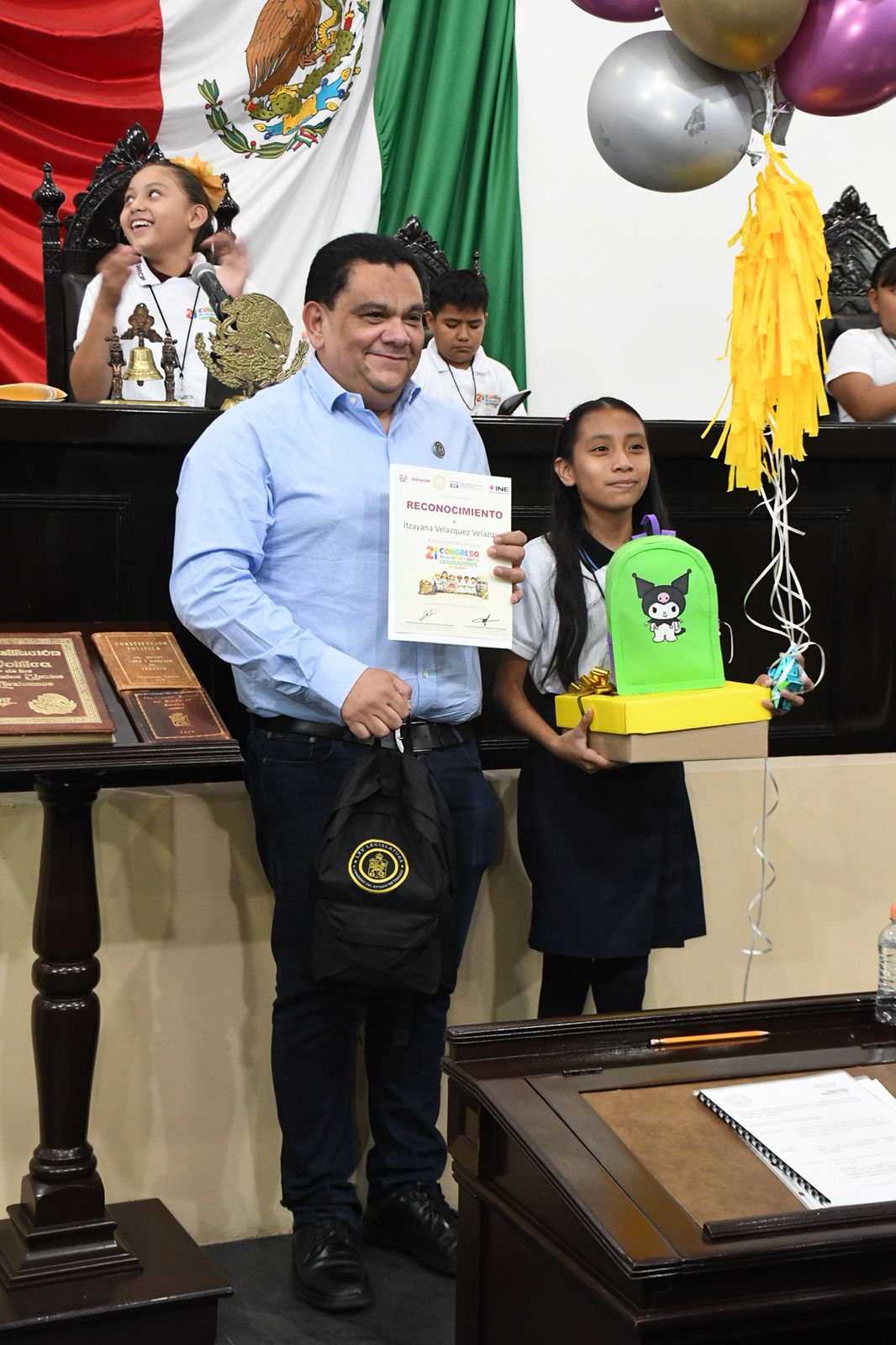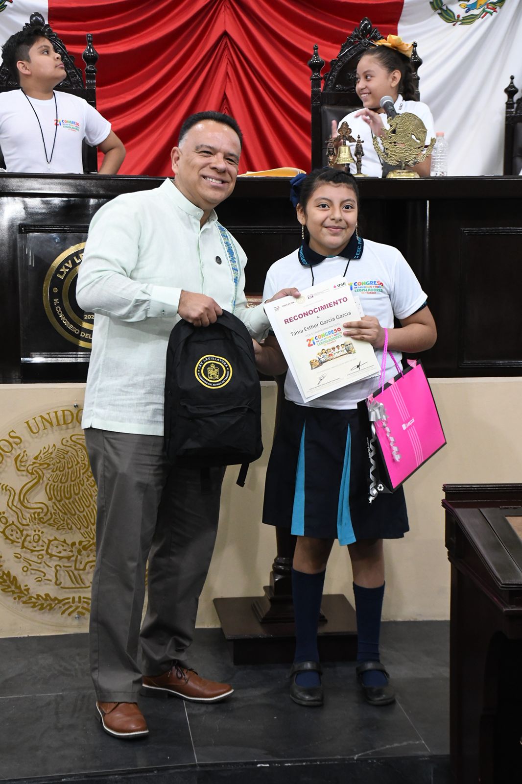 Para concluir la sesión del 21º Congreso de las Niñas y Niños Legisladores de Tabasco, las y los pequeños recibieron reconocimiento por su destaca participación en el Parlamento Infantil, así como obsequios de parte de la LXV Legislatura, de cada uno de sus integrantes y del Secretario de Asuntos Parlamentarios.