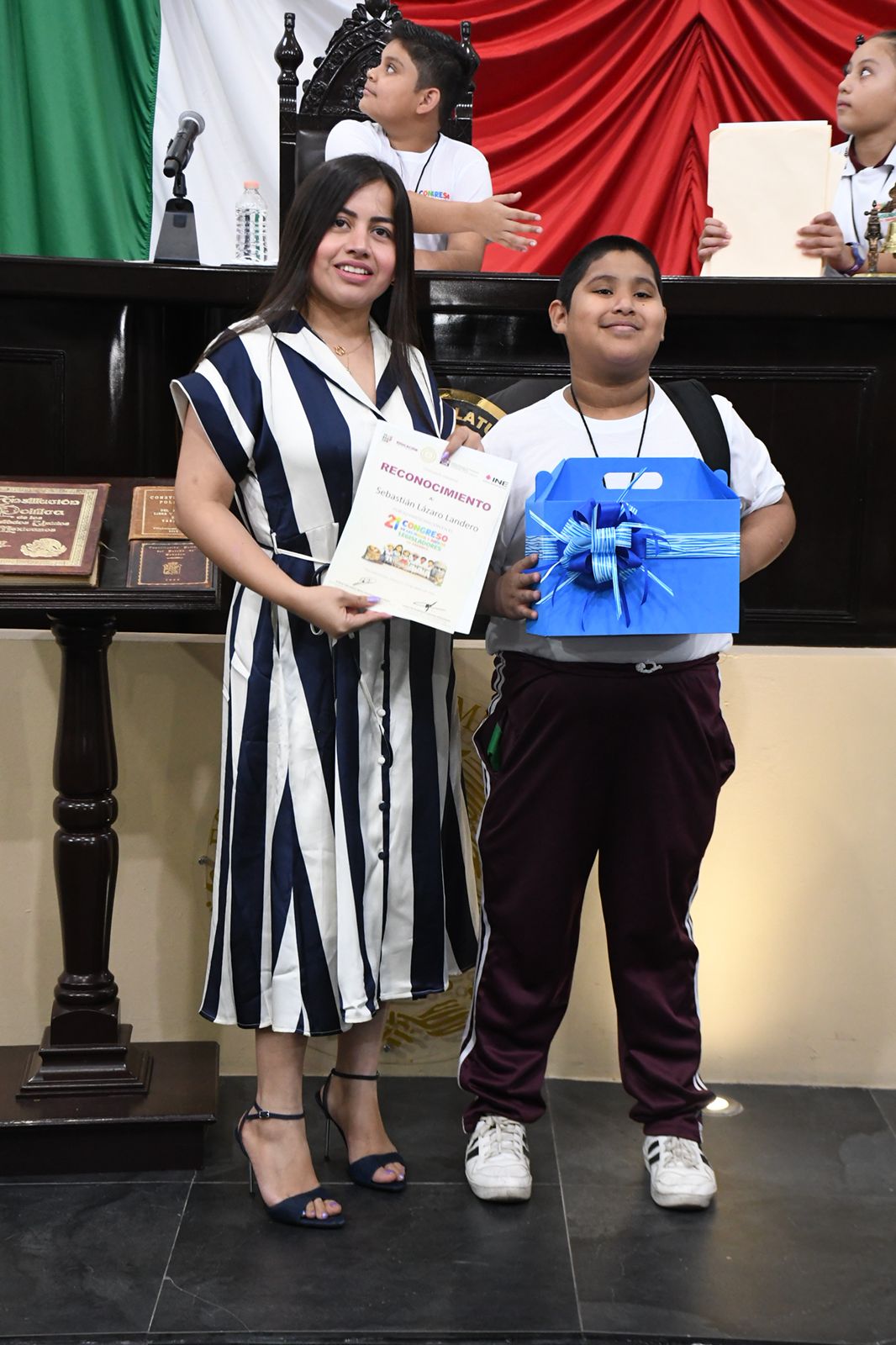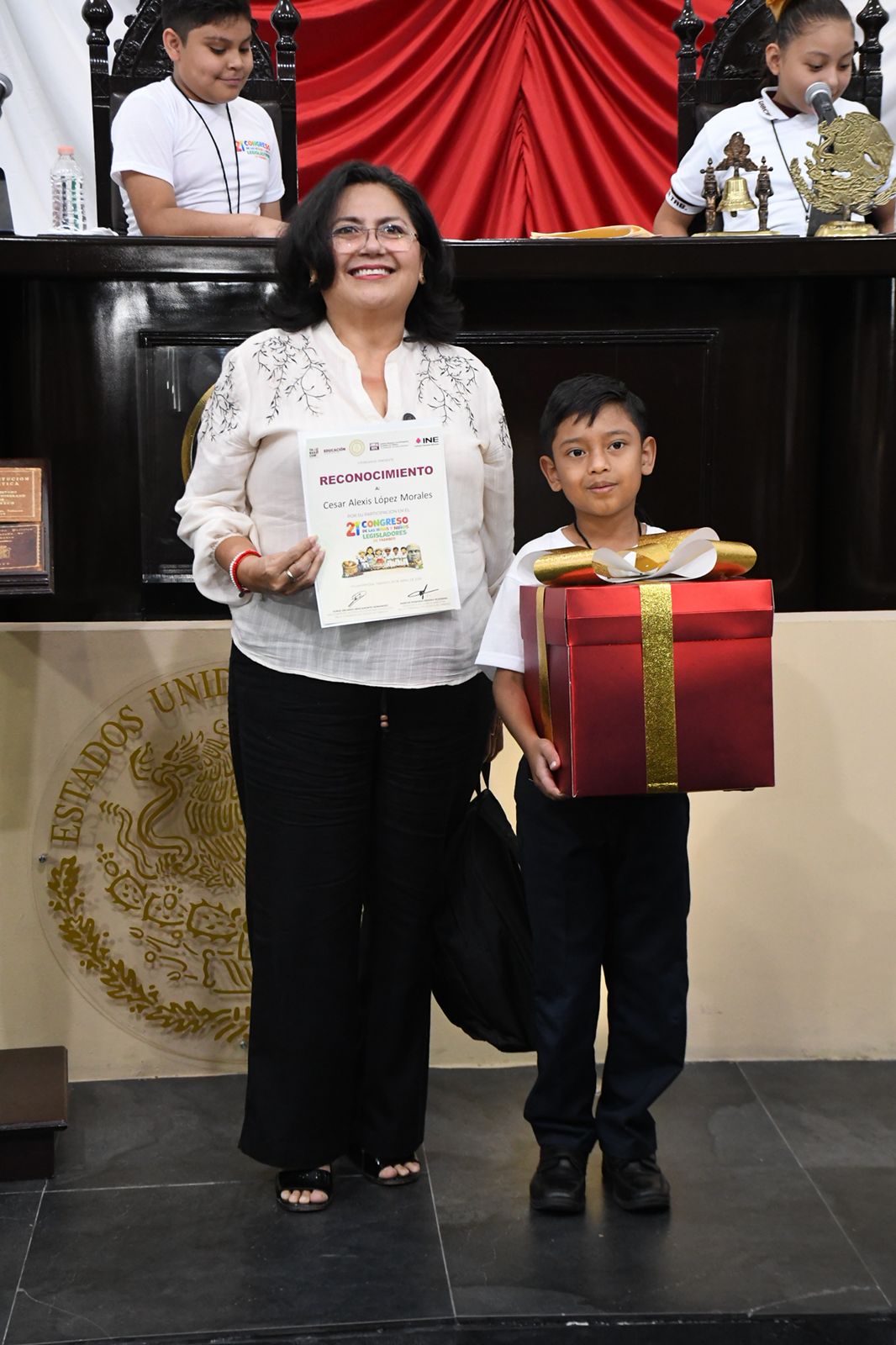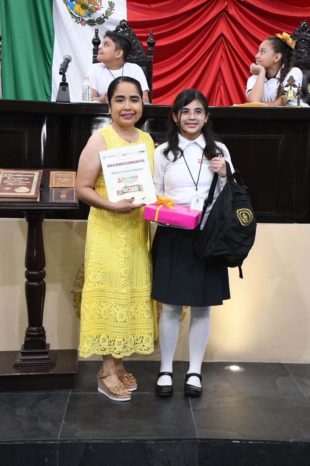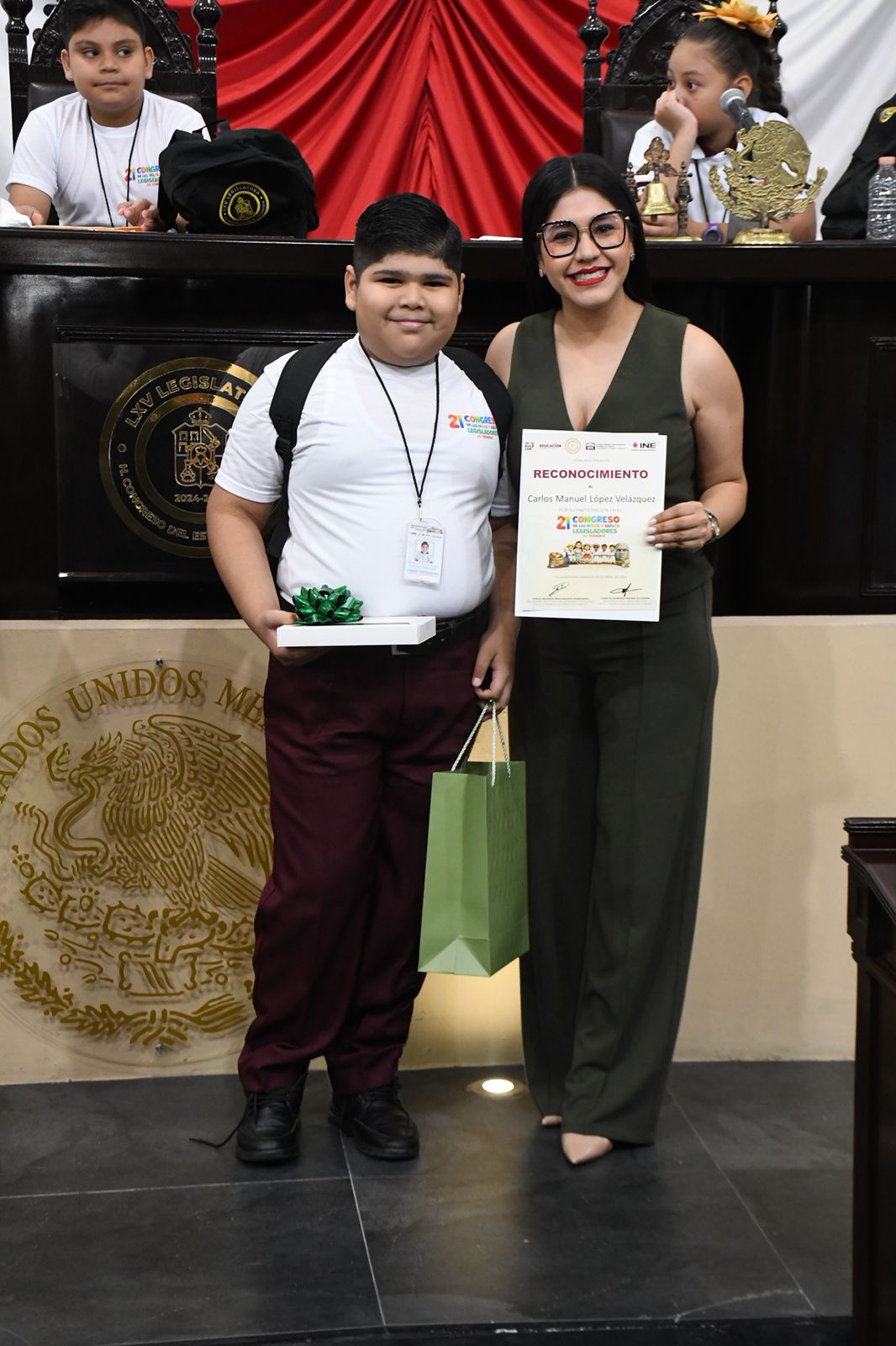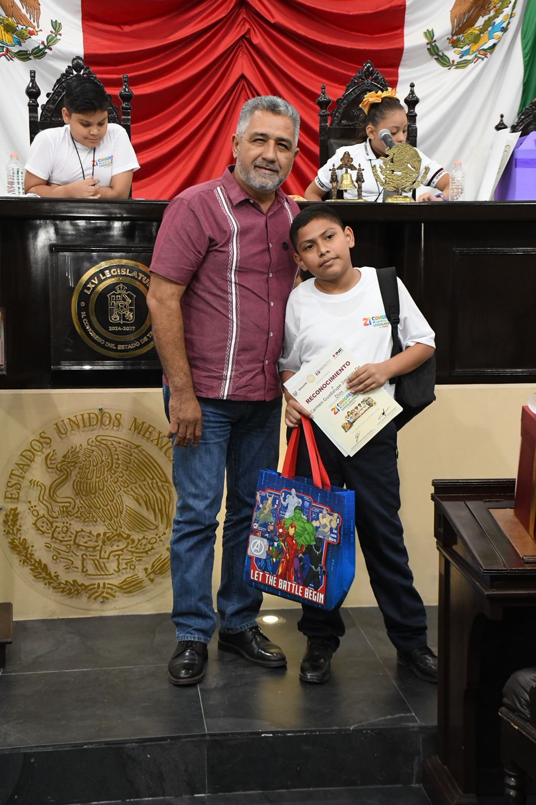 Para concluir la sesión del 21º Congreso de las Niñas y Niños Legisladores de Tabasco, las y los pequeños recibieron reconocimiento por su destaca participación en el Parlamento Infantil, así como obsequios de parte de la LXV Legislatura, de cada uno de sus integrantes y del Secretario de Asuntos Parlamentarios.