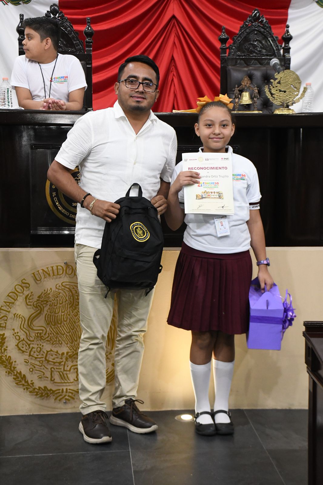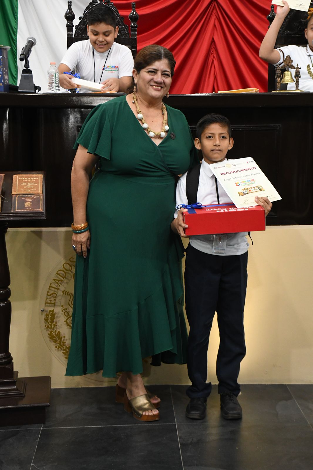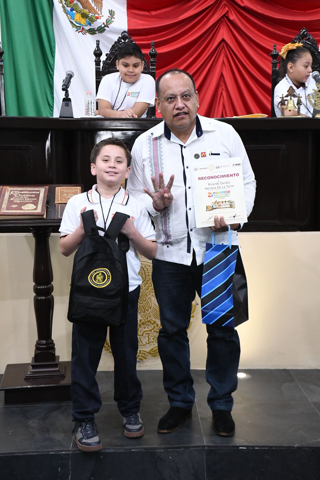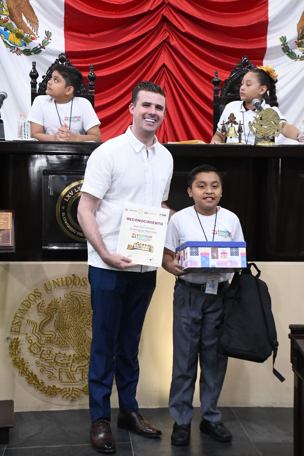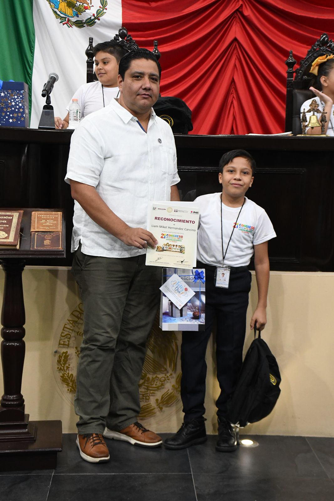Para concluir la sesión del 21º Congreso de las Niñas y Niños Legisladores de Tabasco, las y los pequeños recibieron reconocimiento por su destaca participación en el Parlamento Infantil, así como obsequios de parte de la LXV Legislatura, de cada uno de sus integrantes y del Secretario de Asuntos Parlamentarios.