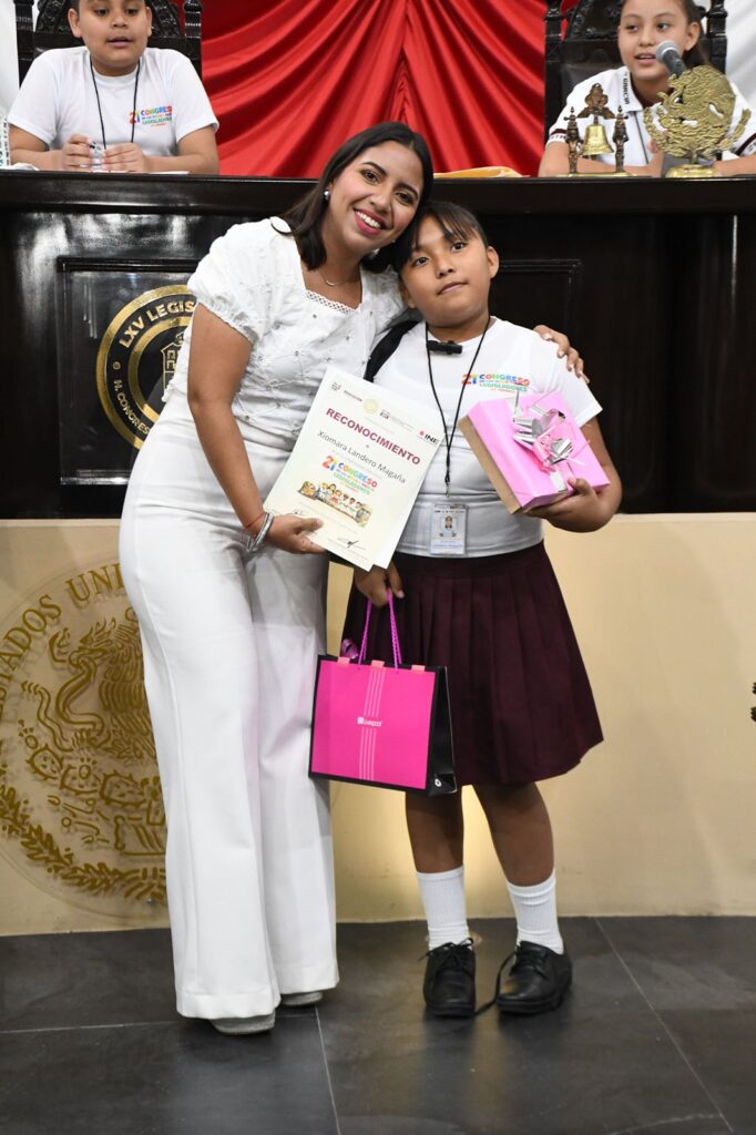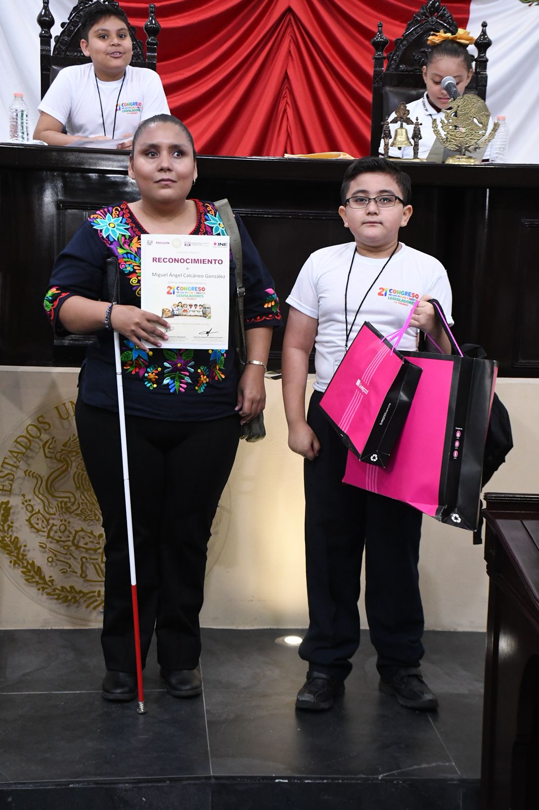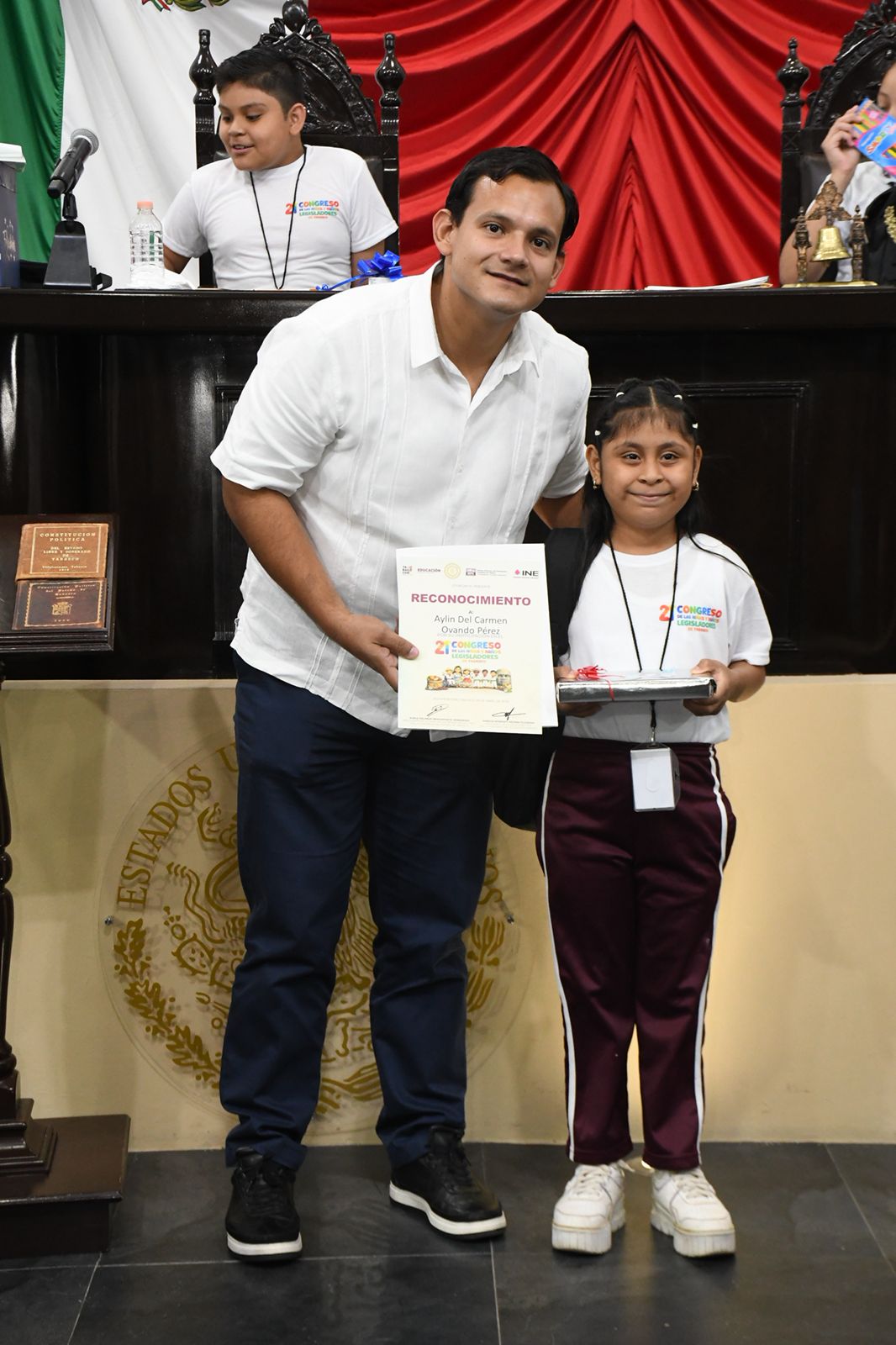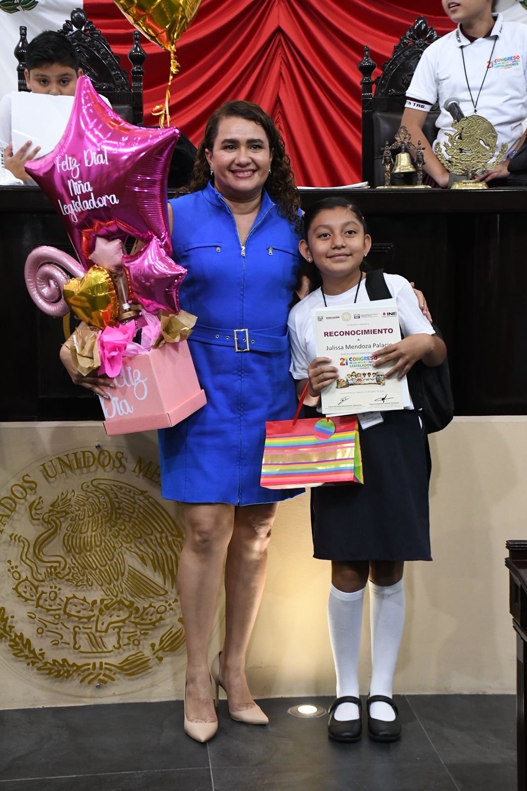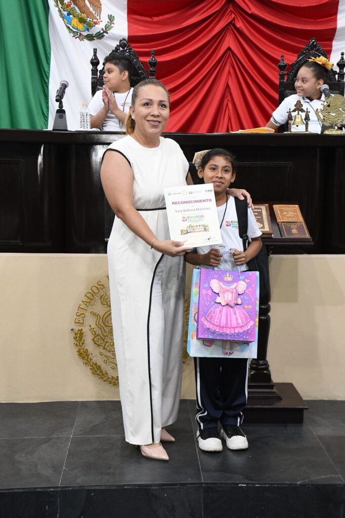 Para concluir la sesión del 21º Congreso de las Niñas y Niños Legisladores de Tabasco, las y los pequeños recibieron reconocimiento por su destaca participación en el Parlamento Infantil, así como obsequios de parte de la LXV Legislatura, de cada uno de sus integrantes y del Secretario de Asuntos Parlamentarios.