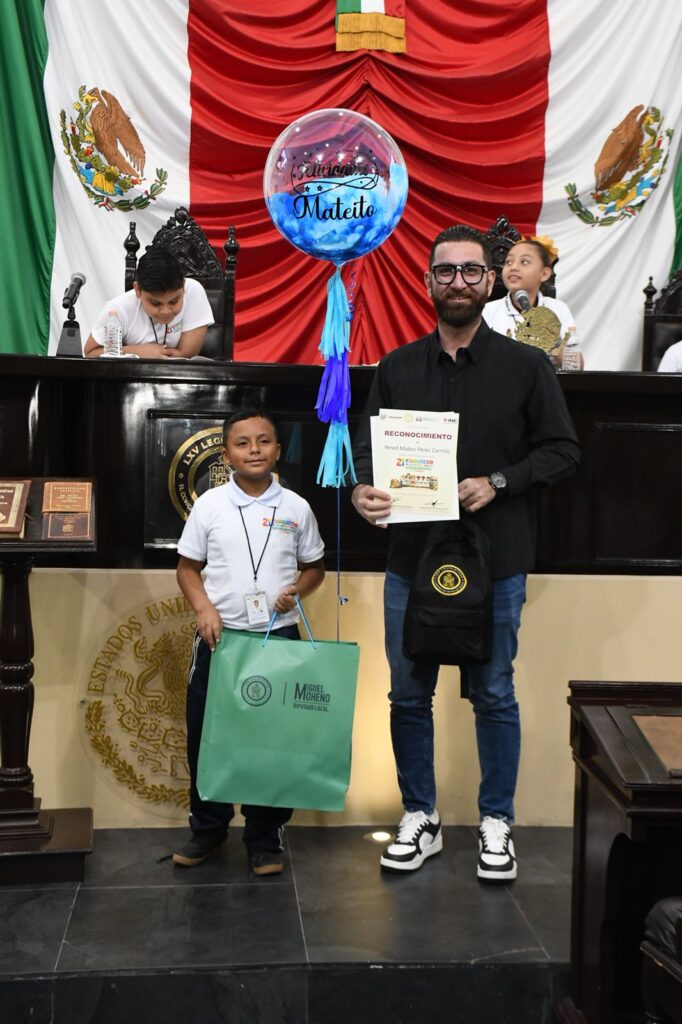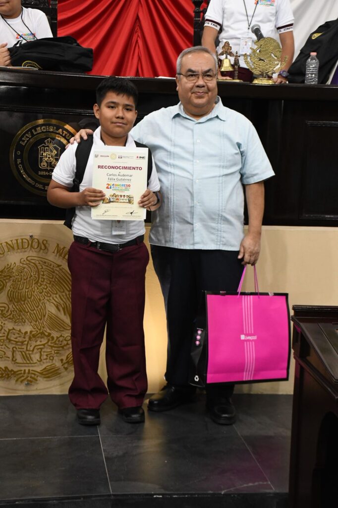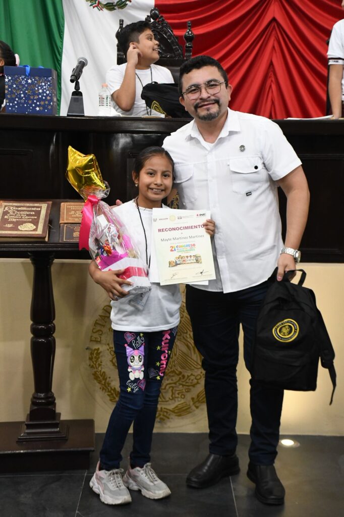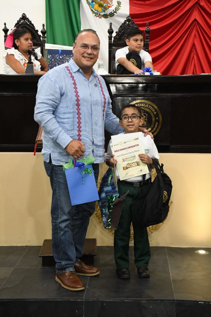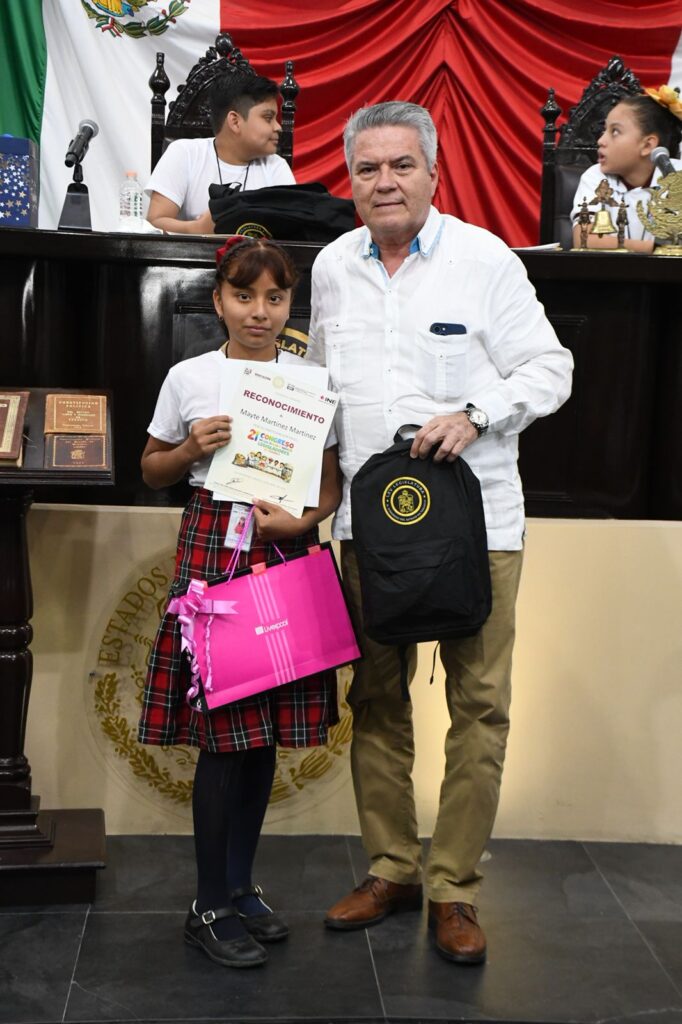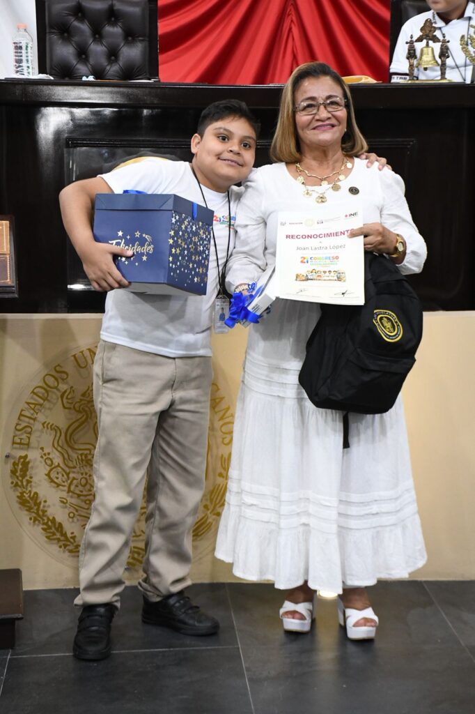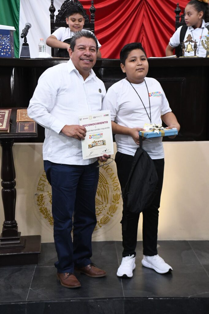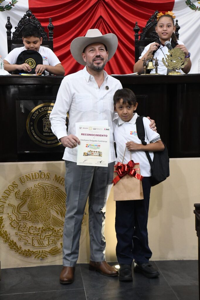 Para concluir la sesión del 21º Congreso de las Niñas y Niños Legisladores de Tabasco, las y los pequeños recibieron reconocimiento por su destaca participación en el Parlamento Infantil, así como obsequios de parte de la LXV Legislatura, de cada uno de sus integrantes y del Secretario de Asuntos Parlamentarios.